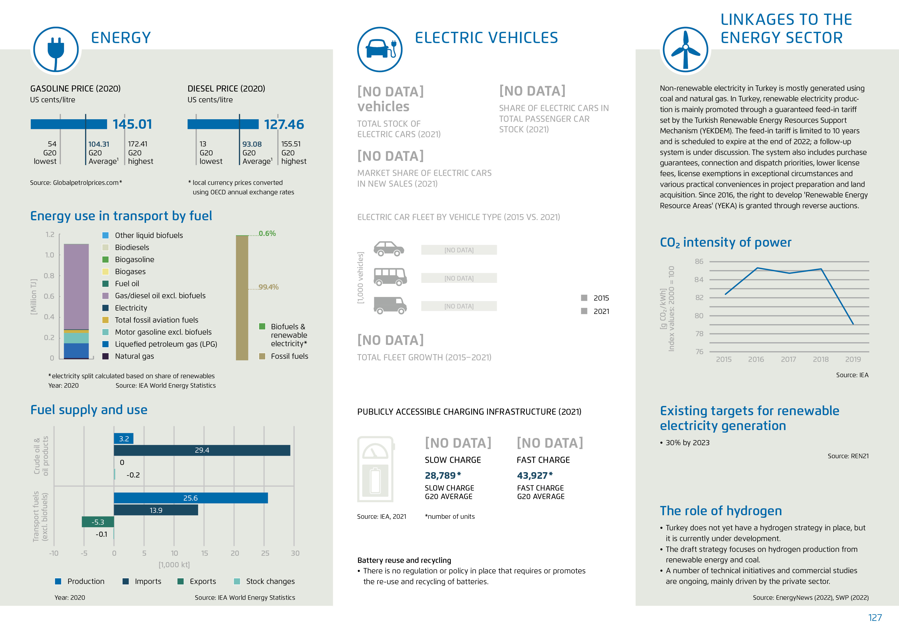 Der türkische Aktionsplan zum Klimawandel für 2011–2023 legt quantitative Ziele für die Erhöhung des Anteils von Schienenverkehr und Schifffahrt am Personen- und Güterverkehr fest und skizziert qualitative Ambitionen für 2030. Diese wurden festgelegt, bevor die Türkei ihre Verpflichtung bekannt gab, bis 2053 eine Netto-Null-Wirtschaft zu erreichen. Die bisher umgesetzten Maßnahmen konzentrieren sich vor allem auf die Verwirklichung dieser Verkehrsverlagerung. Zur Förderung der Fahrzeugeffizienz sind nur wenige Maßnahmen vorhanden. Die Elektrifizierung konzentriert sich auf den Verkauf neuer Lkw und Busse mit dem Ziel, bis 2040 100 Prozent des Absatzes zu erreichen. Für Elektrofahrzeuge gibt es Steueranreize, auch deren Herstellung unterstützt die Regierung.