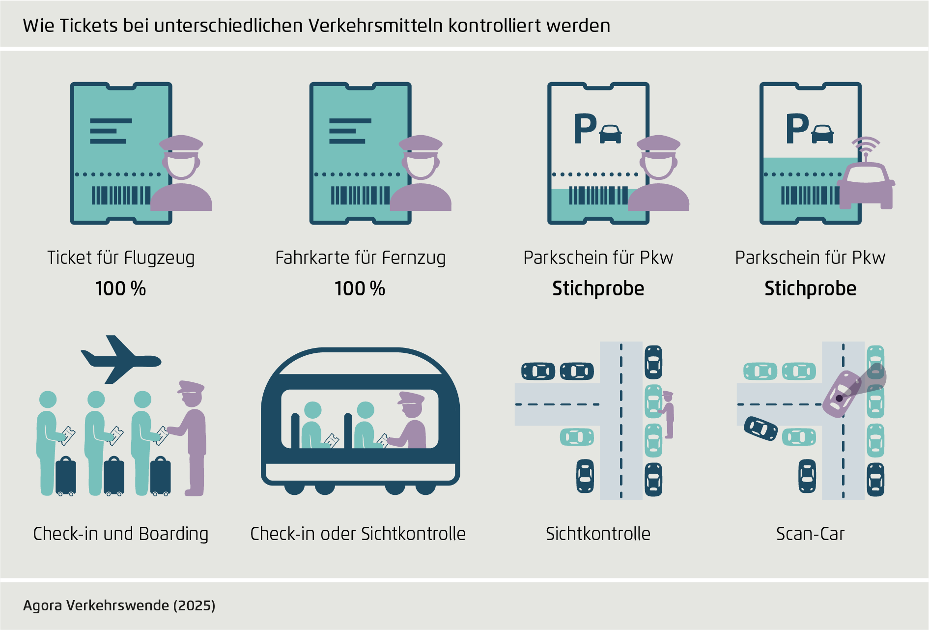 Auch mit Scan-Fahrzeugen würden Berechtigungen für das Parken im Straßenraum also nicht in Gänze kontrolliert werden. Damit würde sich das on-street-Parken weiterhin deutlich vom Parken in Parkhäusern, aber auch von Bahn- und Flugreisen unterscheiden. In diesen Fällen werden stets alle Nutzerinnen und Nutzer kontrolliert, ob sie für die in Anspruch genommene Dienstleistung ein gültiges Ticket haben (siehe Grafik).