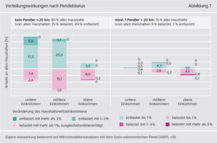 Bezieher unterer und mittlerer Einkommen sowie Haushalte mit Kindern gehören im Durchschnitt zu den Begünstigten einer solchen CO2-Bepreisung, während einkommensstarke und Ein-Personen-Haushalte durchschnittlich eine sehr moderate Zusatzbelastung erfahren. Pendlerhaushalte und Haushalte in ländlichen Räumen werden – entgegen landläufiger Erwartung – nicht in substanziellem Maße belastet. Wird die gegenwärtige Entfernungspauschale aufkommensneutral zu einem einkommensunabhängigen Mobilitätsgeld weiterentwickelt, dann gehören Pendelnde in unteren und mittleren Einkommensgruppen sogar zu den Gewinnern.