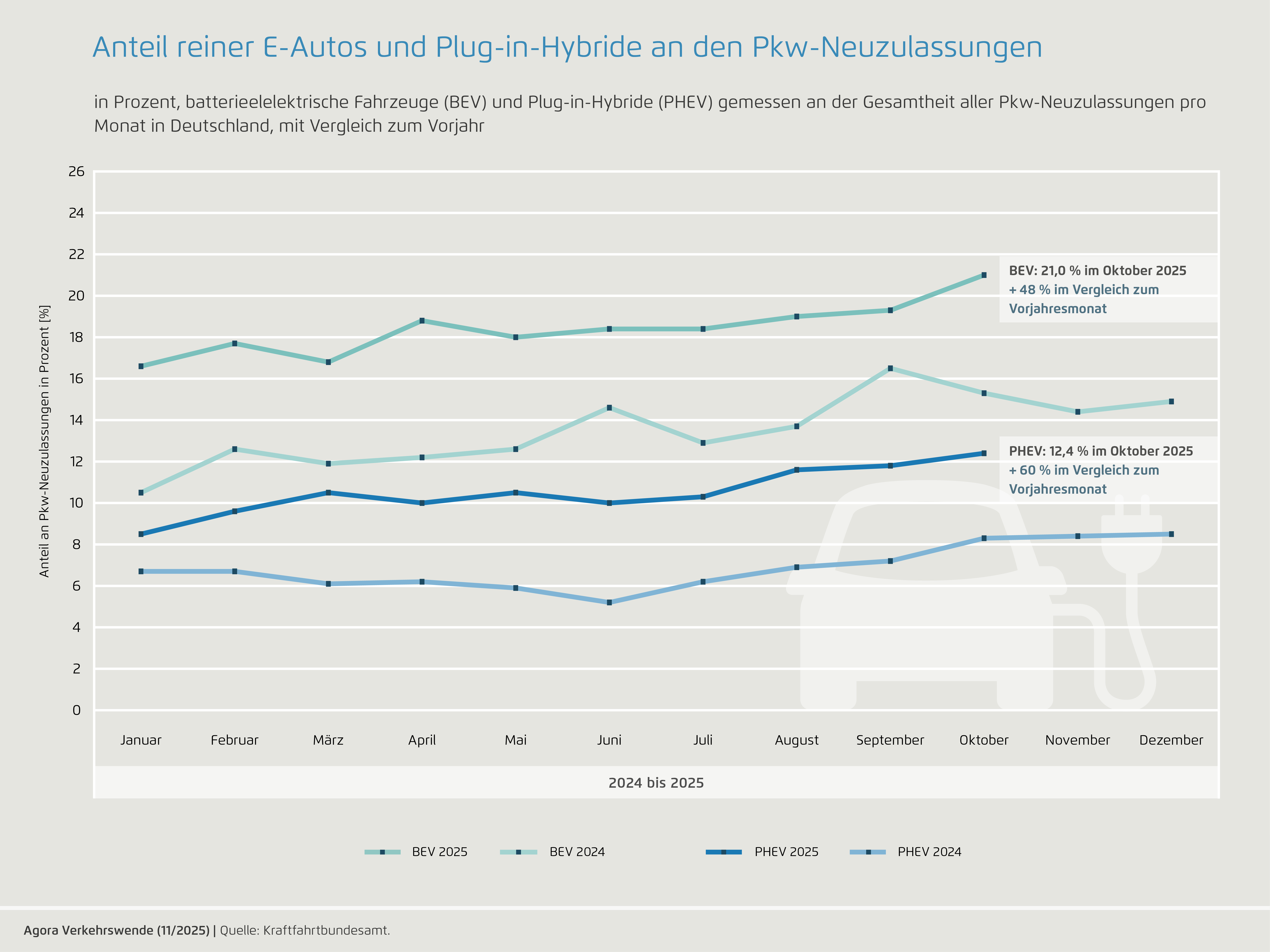 Der Anteil reiner Elektroautos an den Pkw-Neuzulassungen betrug im Oktober erstmals im Jahr über 20 Prozent. Immer mehr elektrische Modelle schlagen ihr Pendant mit Verbrennungsmotor bei den Gesamtkosten über mehrere Jahre.