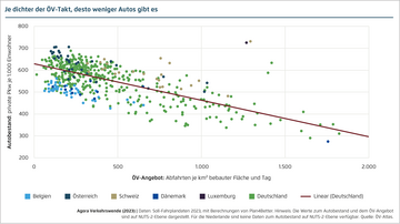 Ein Drittel der Menschen in Deutschland (27 Millionen) lebt in Gemeinden mit einem guten ÖV-Angebot, also mehr als 750 Abfahrten pro Tag und Quadratkilometer. 29 Prozent der Menschen (24 Millionen) lebt hingegen in Gemeinden mit weniger als 250 Abfahrten pro Tag. In diesen Gemeinden ist man auf das eigene Auto oder den Schulbus angewiesen.