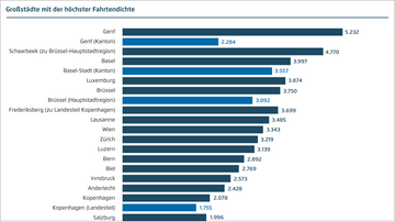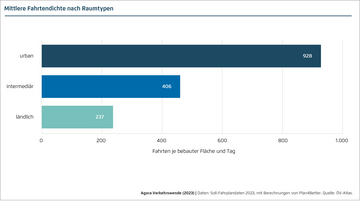 Damit die Angaben zur Fahrtendichte nicht durch Wälder, Ackerflächen oder Seen verzerrt werden, wurden alle Abfahrten bzw. Ankünfte innerhalb einer Gemeinde auf deren Siedlungs- und Verkehrsfläche umgelegt. Dafür steht die Kategorie „Fahrten je bebauter Fläche“.