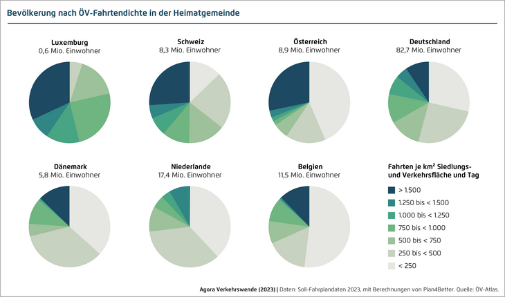 Im Vergleich der untersuchten Staaten führt klar das kleine Fürstentum Luxemburg. Trotz eher kleinstädtischer Raumstruktur fährt der Nahverkehr hier flächendeckend in einem dichten Takt und ist überdies – auch wenn das nicht die vorliegende Wertung einfließt – seit 2020 für die Fahrgäste kostenlos. Auch in der Schweiz und in Österreich ist das ÖV-Angebot für die meisten Menschen besser als in Deutschland, wobei es in Österreich ein starkes Gefälle zwischen sehr gut und schlecht erschlossenen Räumen gibt. Für die Menschen in Belgien und Dänemark stellt sich das Bus- und Bahnangebot ähnlich umfangreich dar wie in Deutschland. Im Fahrradland Niederlande ist man mit den Öffentlichen oft schlechter angebunden als hierzulande.